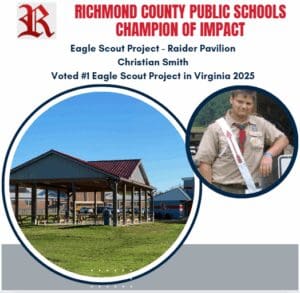 “Richmond County Public Schools is proud to recognize former student Christian Smith for his outstanding achievement and lasting contribution to the school community. Christian organized and led the construction of the Raider Pavilion on the Rappahannock High School campus as part of his Eagle Scout service project. For this remarkable effort, Christian was honored with the Eagle Scout Service Project of the Year award during the Heart of Virginia Council’s Annual Eagle Scout Class Commencement Ceremony, held at Randolph-Macon College. The Raider Pavilion has become a valuable addition to the school grounds, serving as an outdoor classroom, a gathering space for athletes during track meets, and a venue for team and community events. Thanks to Christian’s vision, leadership, and hard work, students at Richmond County Public Schools now have a dedicated outdoor space that supports learning, collaboration, and school spirit.”