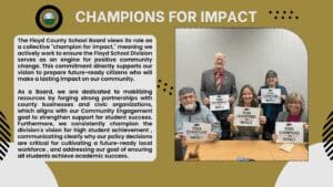 “The Floyd County School Board views its role as a collective “champion for impact,” meaning we actively work to ensure the Floyd School Division serves as an engine for positive community change. This commitment directly supports our vision to prepare future-ready citizens who will make a lasting impact on our community.